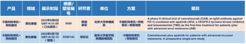 在黑色素瘤领域,AG百家乐医药的卡瑞利珠单抗联合阿帕替尼(“双艾”组合)在2022 ASCO共入选1项口头报告和1项壁报展示。